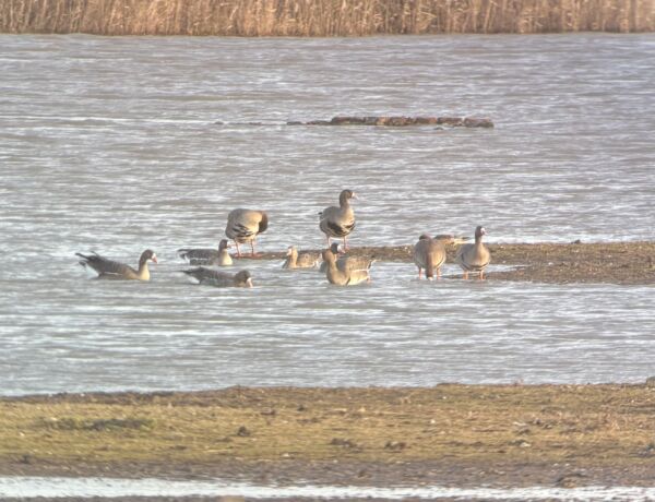 Now sitting at 95 species, we had a decision to make. We knew we had got all we could from the sea (apart from Great Crested Grebe, which is usually a nailed-on certainty in calm conditions) and, because we were beyond frozen by this point, we headed back to have a quick look from the hides. At this point, and in fitting tribute to the conditions, it briefly started snowing. Conversations turned to our longing for Mute Swan or Collared Dove. Was a Grey Heron too much to ask for! Soon after we arrived at the hides, a flock of geese appeared, and we were completely delighted to find that they were Russian White-fronted Geese! Absolutely stunning birds and we were treated to such lovely views. 96, and a glimmer of hope returned to everyone….