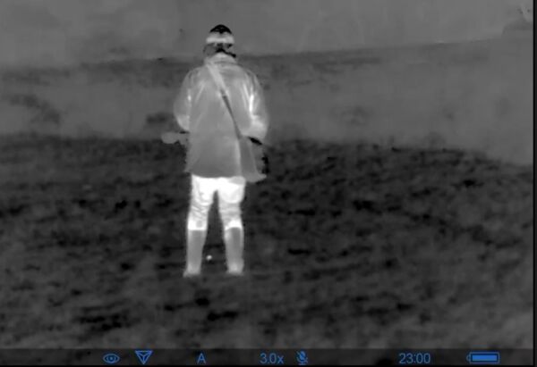Image of Ed through the thermal imager, having approached a bird getting ready to catch