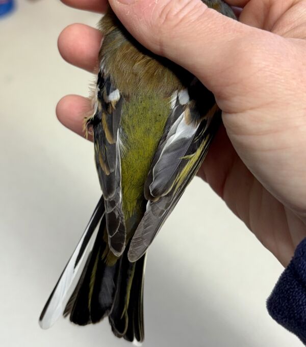 Ringing and ageing birds is often a game of spot the difference, which is easier in some species than others. One of the male Chaffinch I caught was a bird hatched last year in 2025, it had two very noticeable old greater coverts (browner than the nice replaced black feathers). An adult Chaffinch (a bird bird hatched in 2024 or older) would have no contrasts in the feathers and they would all be replaced and in good condition.